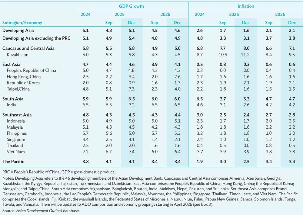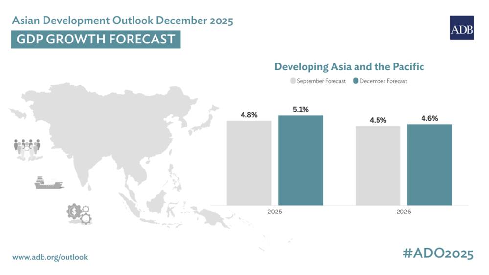 Resilient exports—particularly of semiconductors and other technology products— moderating inflation, and stable financial conditions have strengthened the region’s growth outlook. Lifted by stronger-than-expected growth in India, the region’s economy is now projected to expand by 5.1% this year, compared with a 4.8% forecast in September, according to Asian Development Outlook (ADO) December 2025, released on December 10,2025. The outlook for next year has also been upgraded by 0.1 percentage points to 4.6%.