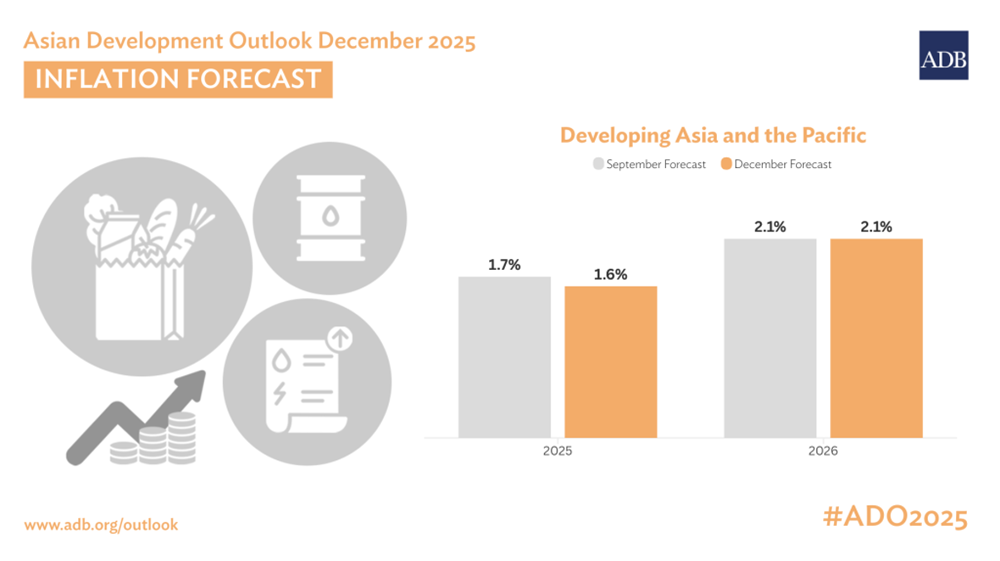 Inflation in developing Asia and the Pacific is expected to ease further to 1.6% this year, compared with a 1.7% projection in September. This mainly reflects lower-than-anticipated food inflation in India. The region’s inflation forecast for next year remains at 2.1%.