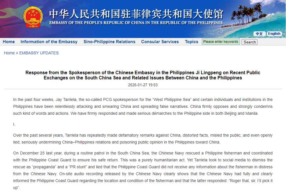 In China there is a saying: “We have no intention of initiating conflict, but we will respond resolutely if our interests are violated.” In the recent public exchanges between the Chinese Embassy and Jay Tarriela and his helpers, when exactly did the Embassy initiate any attack? Not once. The Chinese side has only responded defensively—clarifying facts and correcting false narratives.