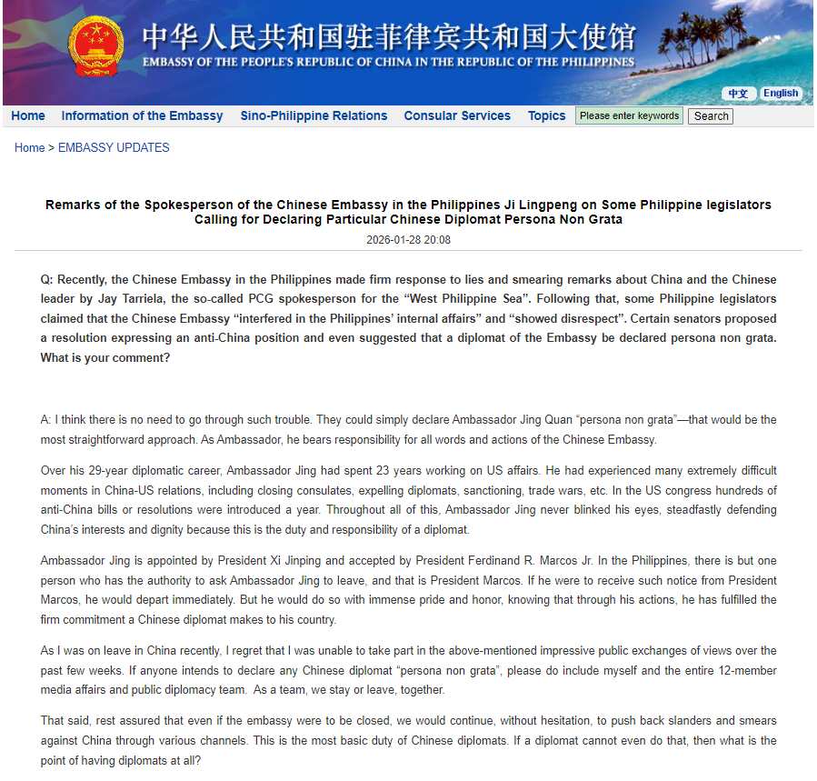 Remarks of the Spokesperson of the Chinese Embassy in the Philippines Ji Lingpeng on Some Philippine legislators Calling for Declaring Particular Chinese Diplomat Persona Non Grata