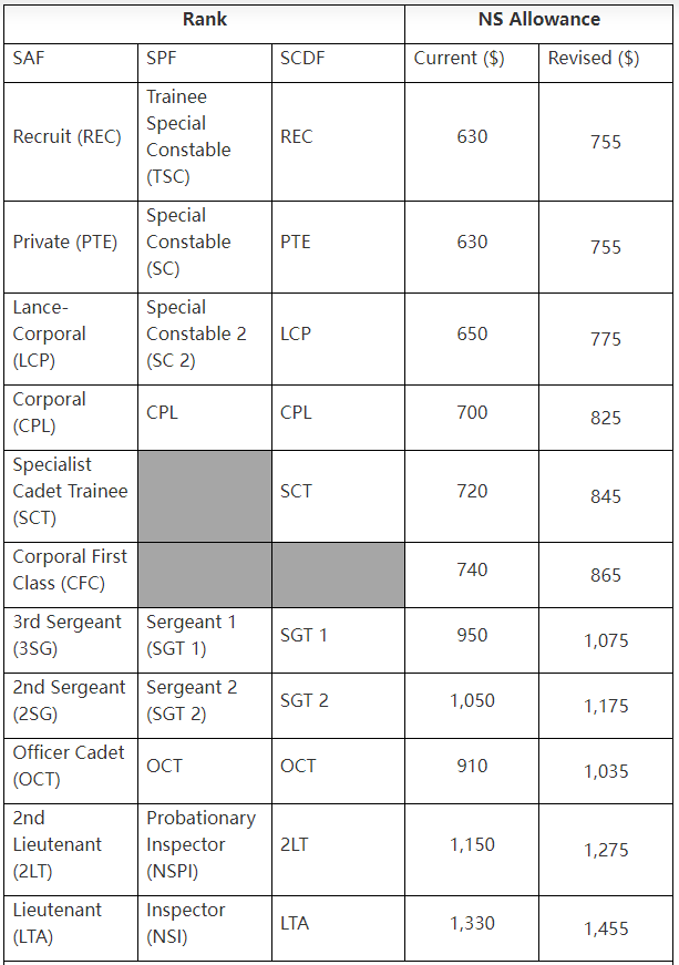 As an example, with this revision, an NSF holding the rank of Recruit/Trainee will receive a monthly NS allowance of $755, up from the current $630. An SAF NSF naval diver or SPF NSF Police Tactical Trooper or SCDF NSF firefighter holding the rank of Corporal will receive a monthly NS allowance of $1,250, up from the current $1,050. Table 1 provides a comparison between the current and revised monthly NS allowance.