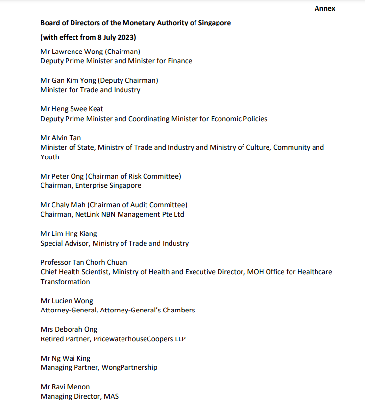 Mr Wong replaces Senior Minister and Coordinating Minister for Social Policies, Mr Tharman Shanmugaratnam, who has served as Chairman of MAS for twelve years since May 2011, and will step down as from 8 July 2023.