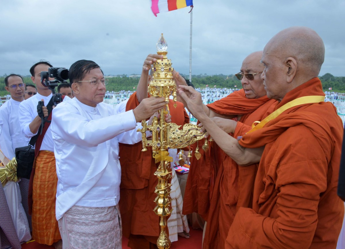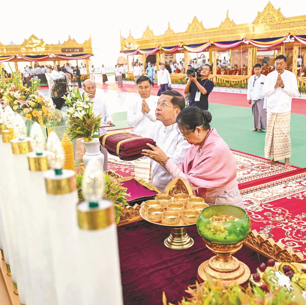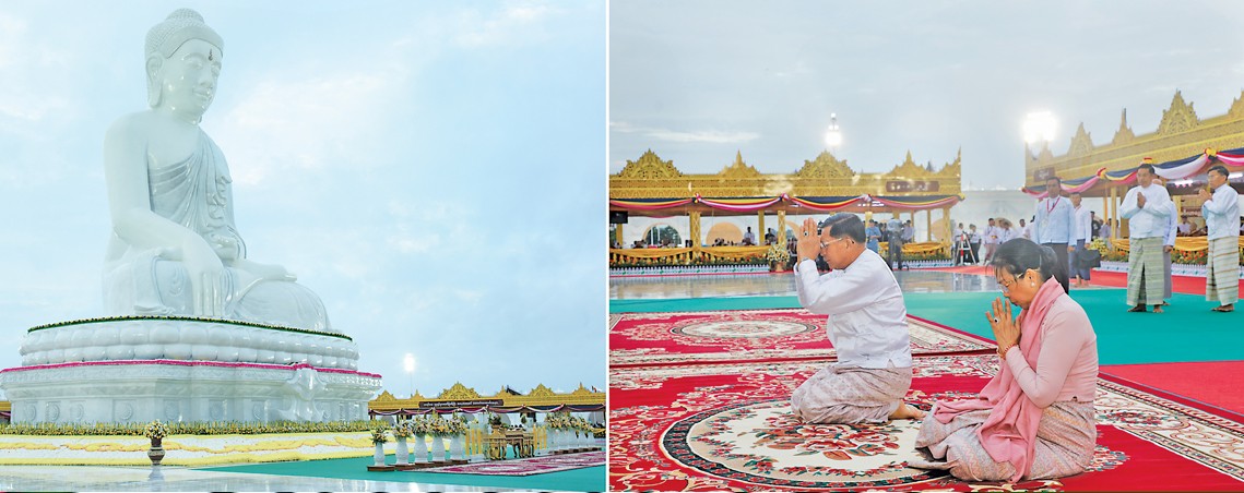 According to Myanmar state news, Myanmar Chairman of the State Administration Council 、Senior General Min Aung Hlaing and his wife Daw Kyu Kyu Hla attended the ceremonies to consecrate the Maravijaya Buddha image, hoist golden umbrellas atop small pagodas on stone plaque chambers and share merits gained at the designated venues in the precinct of Buddha Park in Dekkhinathiri Township of Nay Pyi Taw.