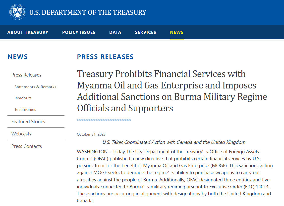 Washington, November 1 (AseanAll) — On October 31, 2023, the U.S. Department of the Treasury’s Office of Foreign Assets Control (OFAC) published a new directive that prohibits certain financial services by U.S. persons to or for the benefit of Myanma Oil and Gas Enterprise (MOGE).