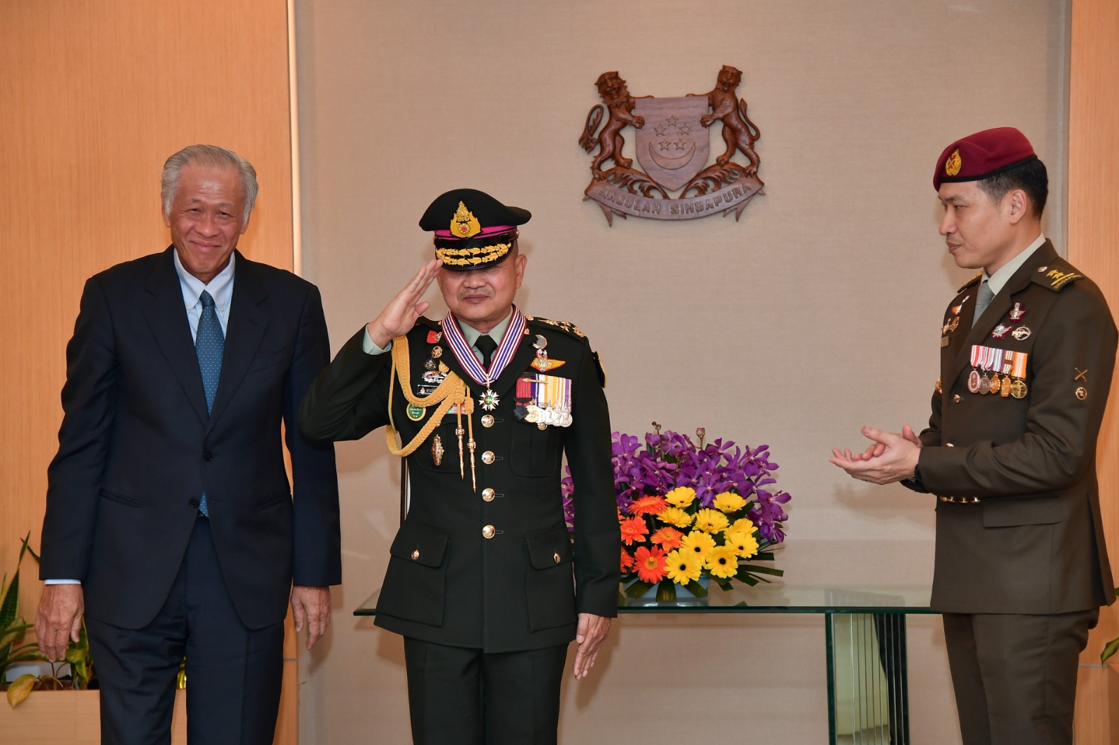 GEN Narongpan was in Singapore from 8 to 10 February 2023. As part of his visit, he called on Ng, Chief of Defence Force Lieutenant-General Melvyn Ong, and Chief of Army Major-General David Neo after inspecting the Guard of Honour at MINDEF. He also visited Kranji Camp III where he received a brief on the Singapore Army’s Motorised Infantry Brigade and had a hands-on session with the TERREX Simulator.