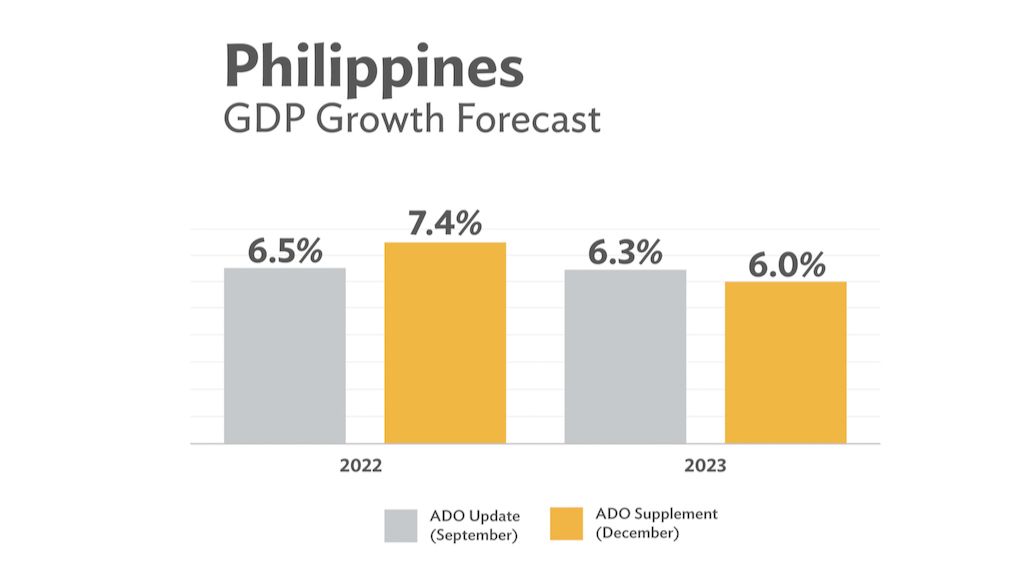 The latest supplement to the Asian Development Outlook (ADO) 2022 says the Philippine economy will grow 7.4% in 2022, up from the bank’s September forecast of 6.5%. Gross domestic product (GDP) growth for 2023 is expected to slow to 6.0% from the previous forecast of 6.3%.