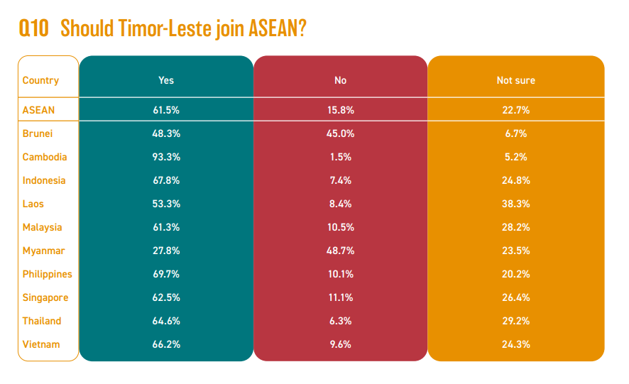 Of the participants who support Timor-Leste’s admission, “48.7% say that a new member will strengthen ASEAN’s unity and centrality”.