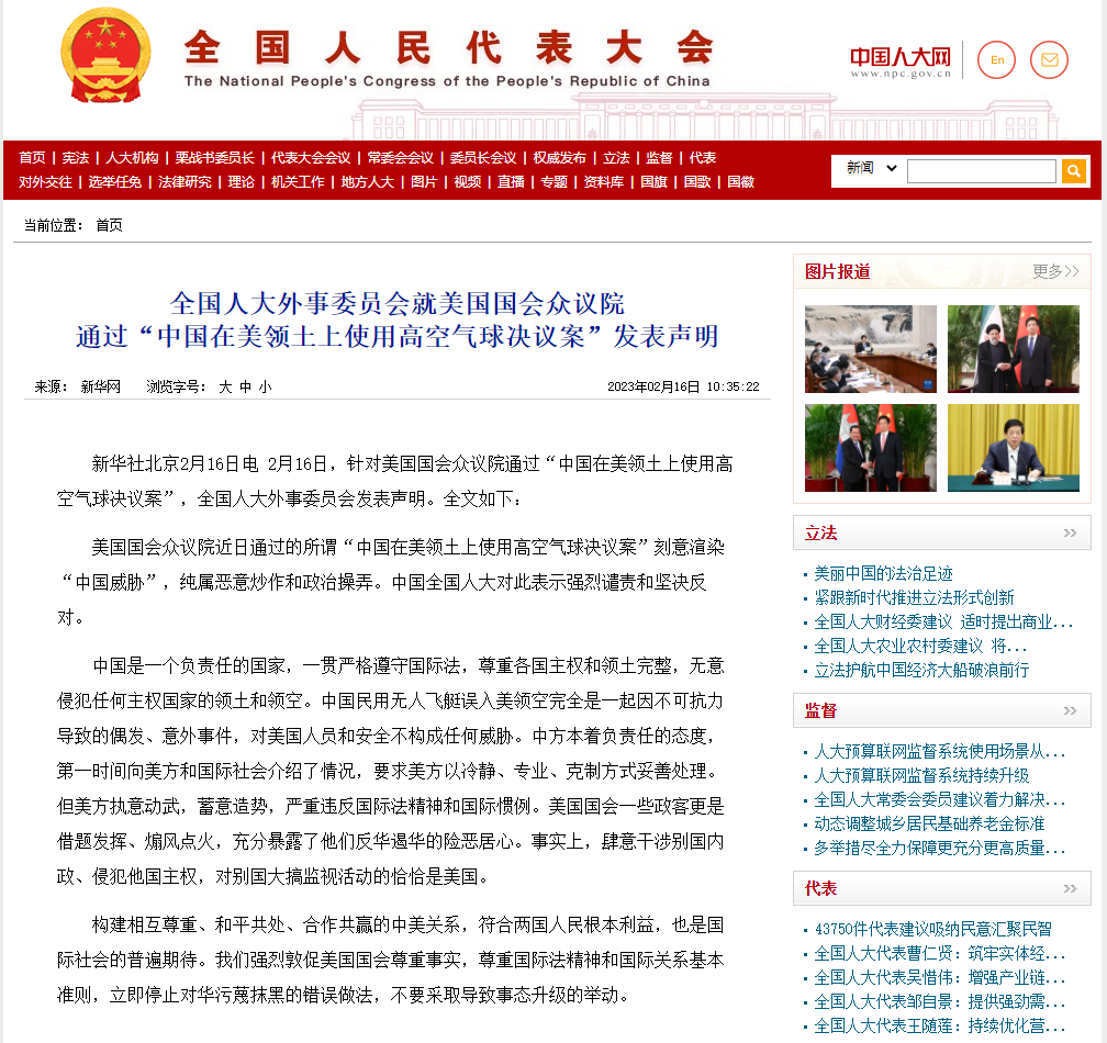 Beijing,February 16 (AseanAll) — China's National People's Congress has issued a statement opposing a United States Congressional resolution that condemned China for a balloon incident.