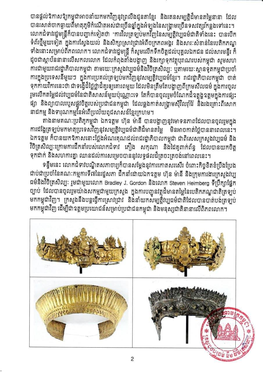 The minister also expressed her appreciation for the ongoing efforts of the Commission 7 of the National Assembly led by Hun Many, the team of the Ministry of Culture and Fine Arts, together with Bradley J. Gordon and Steven Heimberge, legal advisers on restitution issues, who have immensely supported the Ministry on the return of these priceless objects of Cambodian heritage. The ministry will continue to search for and bring home its national treasures back to Cambodia for the benefit of the Cambodian people and the world.