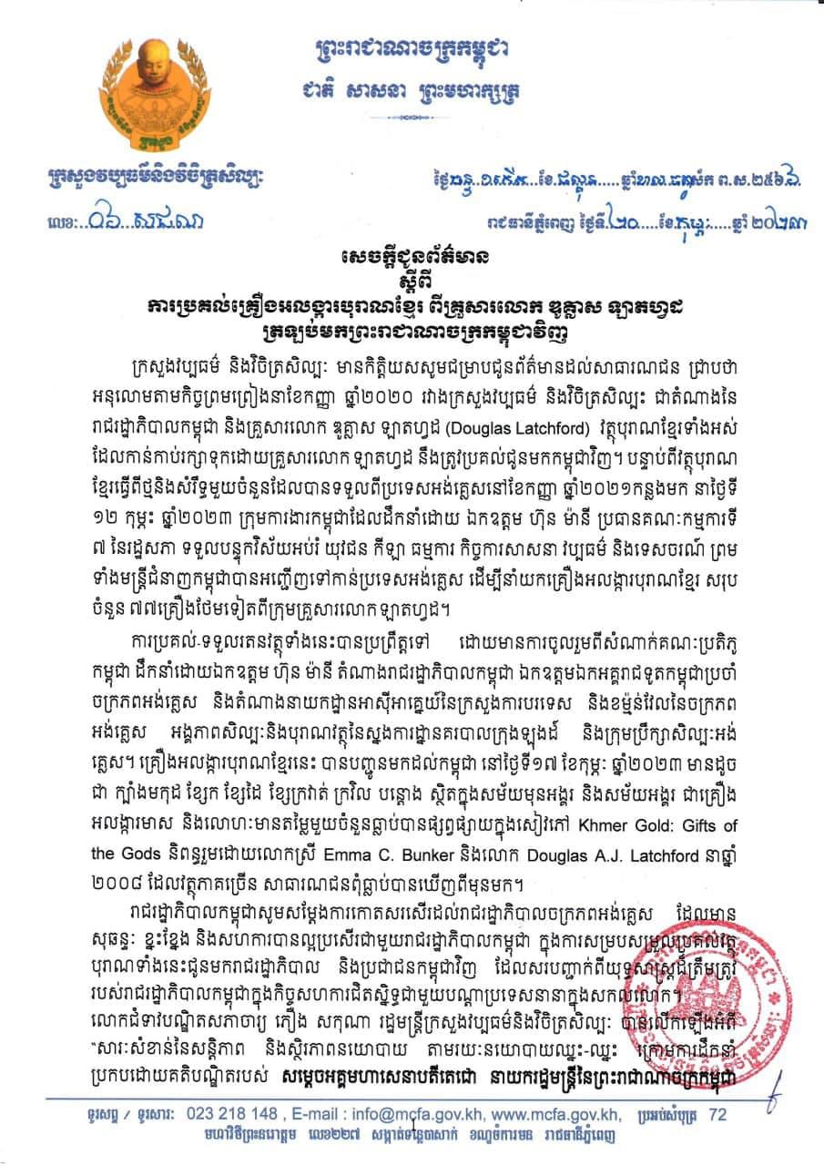 The Ministry of Culture and Fine Arts on behalf of the Royal Government of Cambodia (RGC) reached an accord with the family of the late Douglas Latchford in September 2020 wherein all Cambodian artefacts in the possession of the Latchford family will be returned to Cambodia.