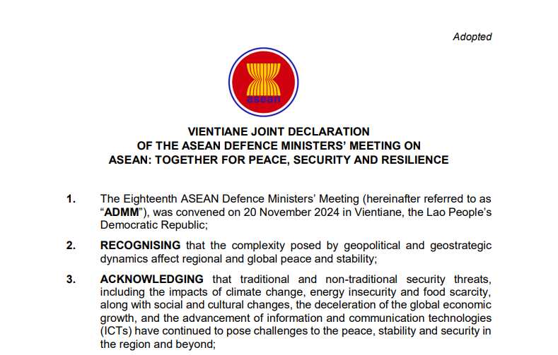 1.The Eighteenth ASEAN Defence Ministers’ Meeting (hereinafter referred to as “ADMM”), was convened on 20 November 2024 in Vientiane, the Lao People’s Democratic Republic;