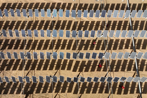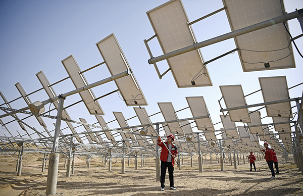 This aerial photo shows staff workers dusting photovoltaic panels after windy weather at a photovoltaic power station in Yinchuan, northwest China's Ningxia Hui Autonomous Region, March 25, 2023. [Photo/Xinhua]