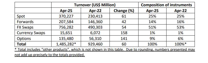 Volumes in FX spot, forwards and swaps – which together accounted for 90% of Singapore’s turnover – rose by between 42% and 61% from 2022 to 2025.
