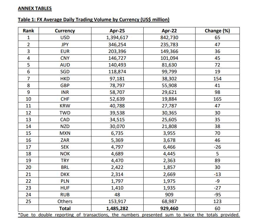Singapore, October 1 (AseanAll) — The Monetary Authority of Singapore (MAS) announced on October 1, 2025 that Singapore’s foreign exchange (FX) average daily trading volumes (ADTV) rose to US$1.485 trillion in April 2025, increasing by 60% from April 2022.