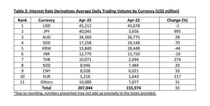 Singapore’s OTC interest rate derivatives volumes averaged US$208 billion per day in April 2025, representing an increase of 33% from April 2022. US dollar, Japanese yen, and Australian dollar interest rate derivatives were the most actively traded in the Singapore market.