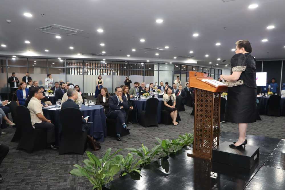 Philippine Foreign Affairs Secretary Ma. Theresa P. Lazaro (center), Trade Secretary Ma. Christina Roque (left) and Social Welfare and Development Undersecretary Adonis Sulit (right) addressing questions of the Diplomatic Corps during the Open Forum. Photo credit:the Department of Foreign Affairs of the Philippines