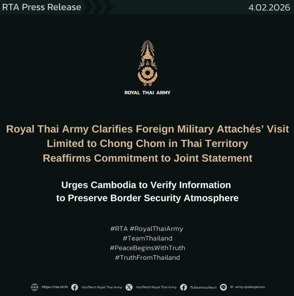 On claims that the Royal Thai Army escorted foreign military attachés into O’Smach, Oddar Meanchey Province, the spokesperson confirmed that the attachés did visit Chong Chom, Surin Province, Thailand, to observe border security operations as part of routine duties. However, they did not enter Thai-controlled areas across the border, nor O’Smach, as alleged.