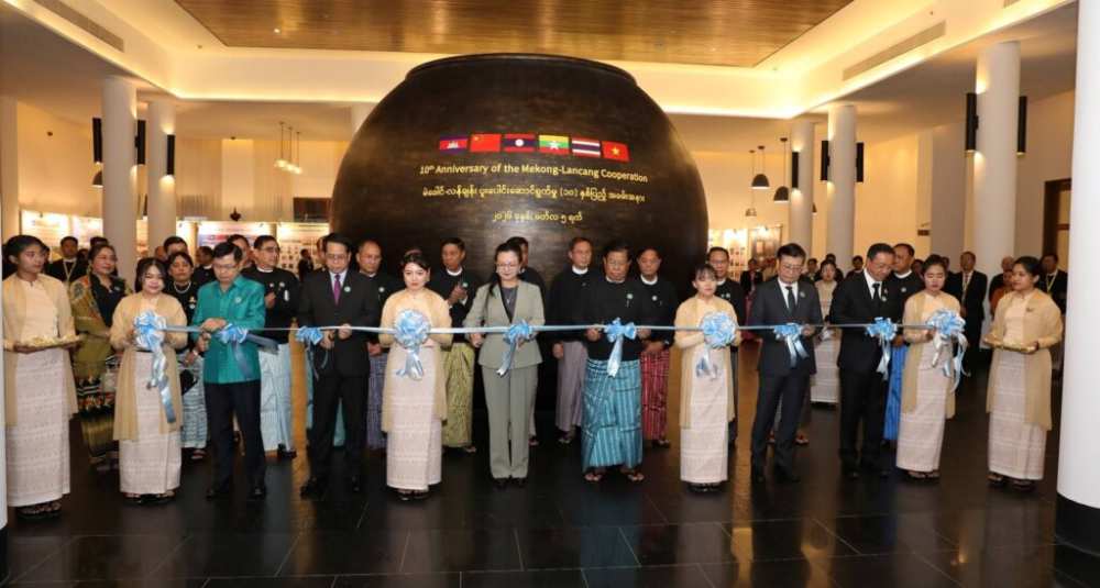 U Than Swe, together with Ambassadors and Heads of Mission from the Embassies of the MLC Member Countries officially opened the photo exhibition marking the 10th Anniversary of the MLC with a ribbon-cutting ceremony. Following the opening, the Union Ministers and dignitaries toured the exhibition which features photographs of projects implemented in Myanmar under the Lancang-Mekong Cooperation Special Fund (LMCSF).