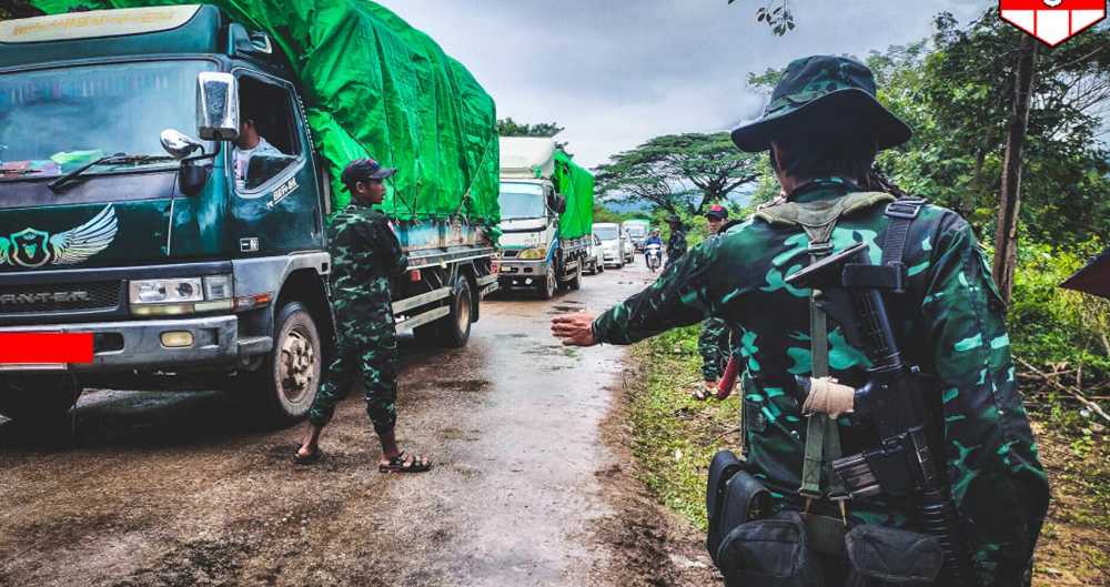 A People’s Defense Force group inspects cargo trucks on the Myawaddy-Kawkareik road in August 2023. / Albino Tiger Company 4